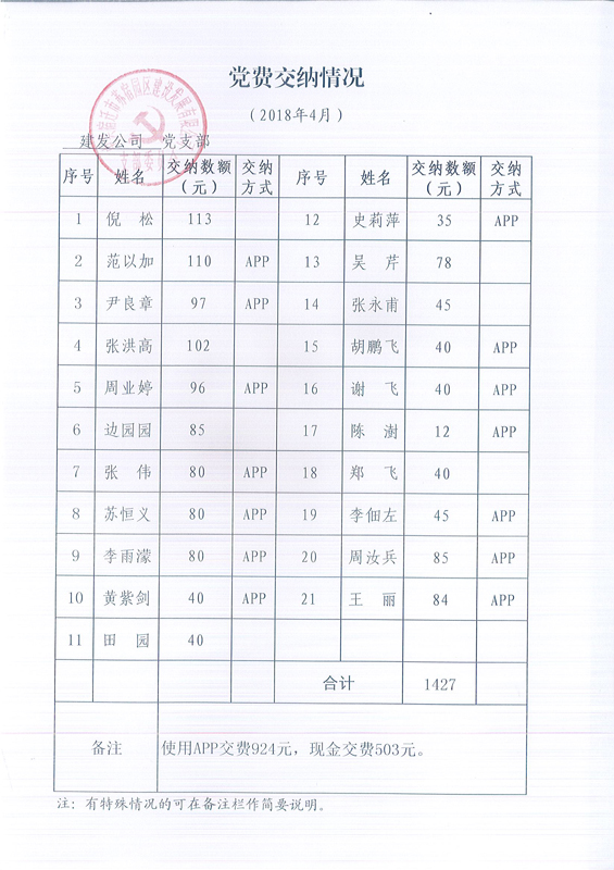 建發(fā)公司黨支部2018年4月份黨費交納公示