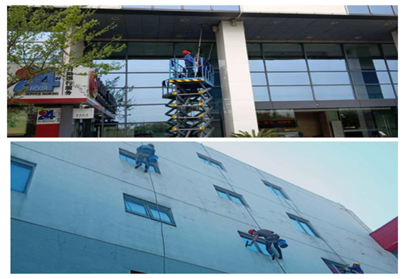 在安全施工的同時嚴格保證服務質量,根據實際情況制定專業(yè)清潔方案,選用專業(yè)外墻清洗劑和玻璃清潔劑,結合使用了升降機、吊繩等方式進行施工操作,對管理樓外墻、幕墻、瓷磚墻面、燈具及道路等衛(wèi)生死角徹底清潔。