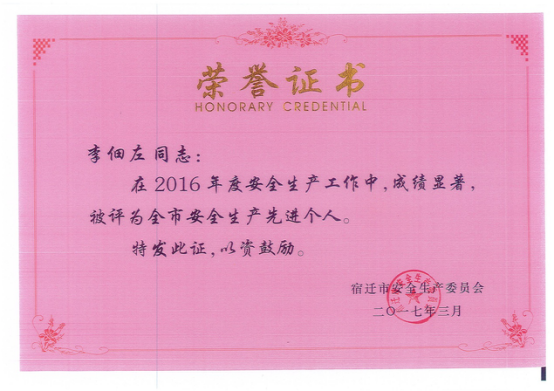 2017年3月,物業(yè)部李佃左同志獲得宿遷市安全生產(chǎn)委員會(huì)授予的“全市安全生產(chǎn)先進(jìn)個(gè)人”榮譽(yù)證書。
