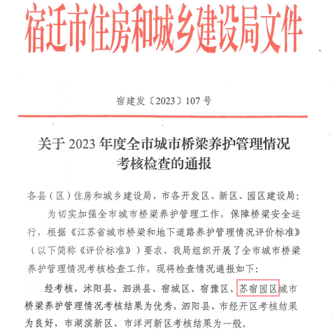 近日,宿遷市住房和城鄉(xiāng)建設(shè)局下發(fā)2023年度全市城市橋梁養(yǎng)護(hù)管理情況考核檢查通報(bào),園區(qū)城市橋梁養(yǎng)護(hù)管理工作再獲佳績(jī)。