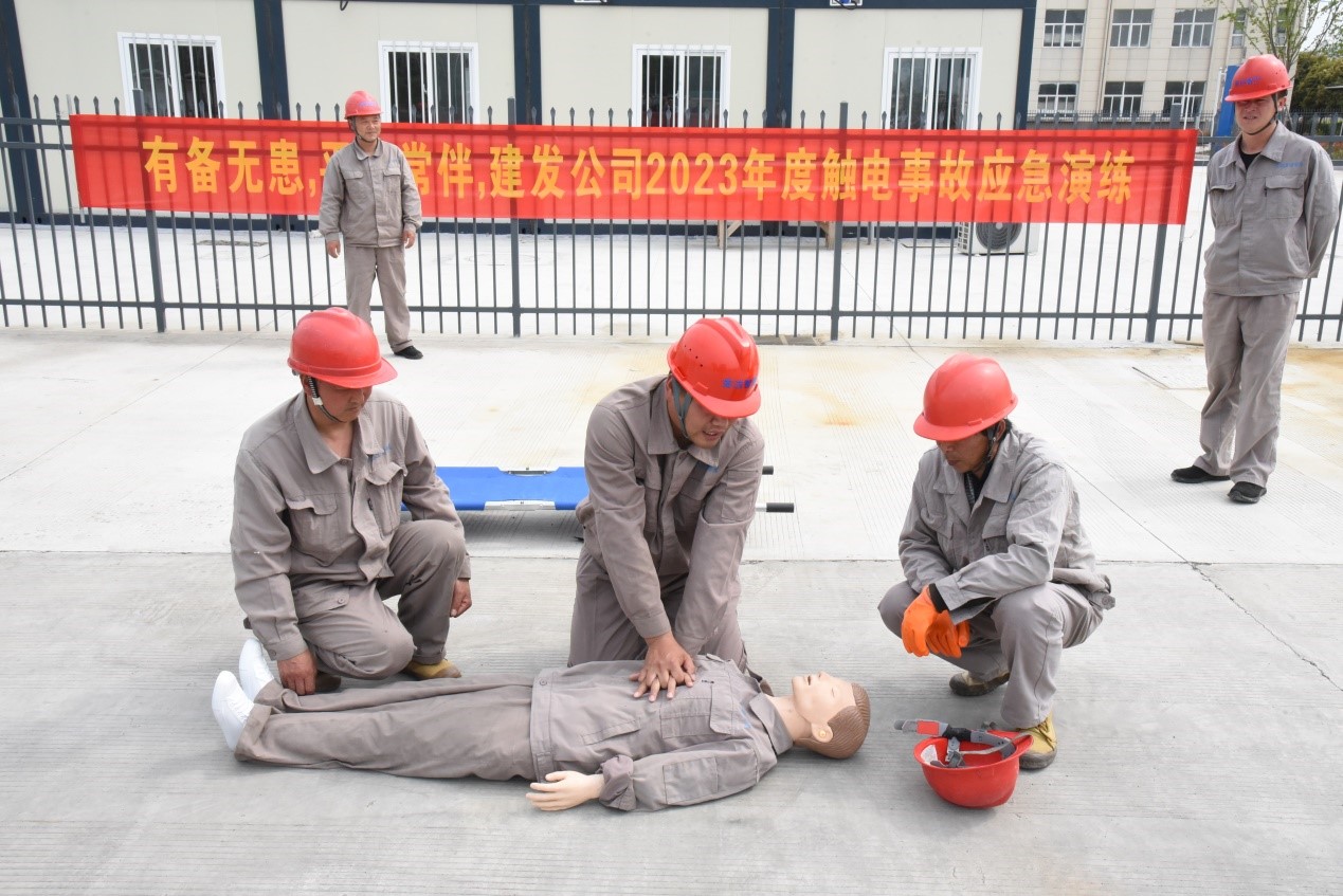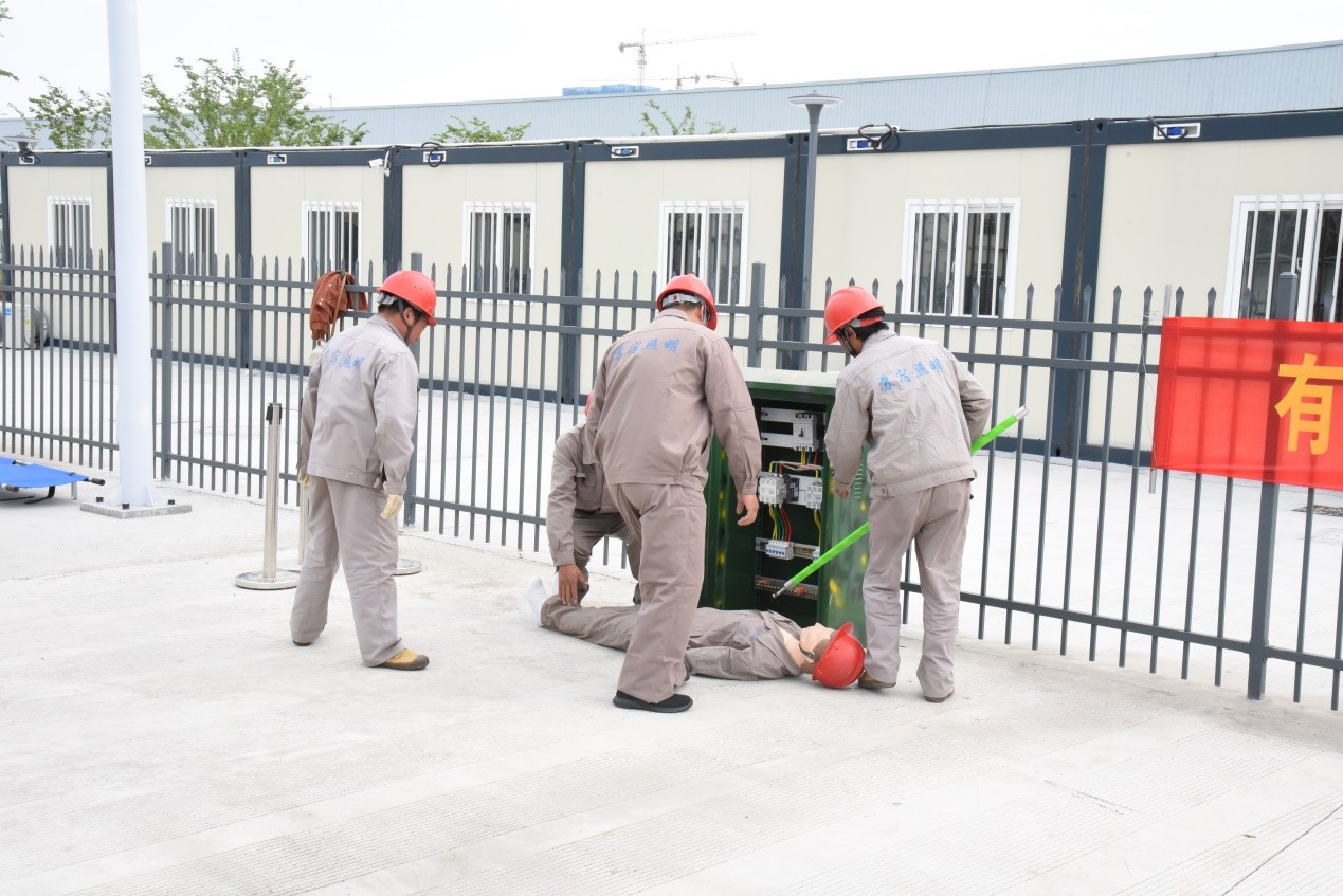 本次演練主要目的是熟悉人身觸電事故處理的流程,演練的重點(diǎn)突出在人身觸電后要及時(shí)斷開(kāi)電源避免造成二次傷害和及時(shí)進(jìn)行現(xiàn)場(chǎng)急救等措施。演練以路燈維修人員在進(jìn)行配電柜內(nèi)部清潔時(shí)誤碰帶電部位發(fā)生人身觸電為主線,貫穿了從事故發(fā)生、現(xiàn)場(chǎng)救援、事故恢復(fù)、到預(yù)案關(guān)閉全過(guò)程。事故發(fā)生后,應(yīng)急指揮小組立即發(fā)布應(yīng)急預(yù)案啟動(dòng)信號(hào),并與就近醫(yī)療服務(wù)單位聯(lián)系,派人外出接應(yīng)急救車輛;同時(shí)現(xiàn)場(chǎng)救援組迅速切斷配電柜電源,將觸電人員轉(zhuǎn)運(yùn)至安全處進(jìn)行搶救;警戒組立即疏散無(wú)關(guān)人員,設(shè)置警戒線,維持現(xiàn)場(chǎng)秩序。參演人員密切配合,相互協(xié)助,嚴(yán)格按照演練要求和現(xiàn)場(chǎng)指揮命令有條不紊開(kāi)展救援行動(dòng),圓滿完成了此次演練任務(wù)。