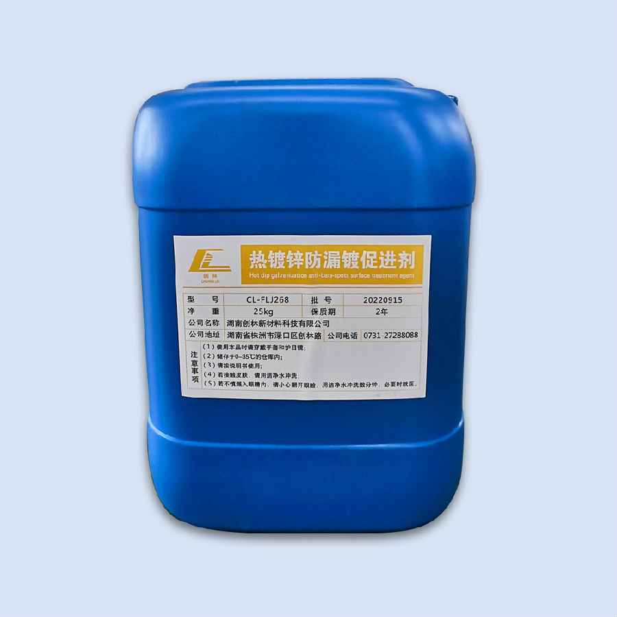 CL-FLJ268熱鍍鋅防漏鍍促進劑為淺藍色水溶液,主要成分為水溶性有機螯合劑、表面活性劑、抗氧劑、活化劑及金屬有機化合物。本產(chǎn)品不含鉛、鎘、汞、鉻(Ⅵ)、氟、磷,屬于環(huán)保型產(chǎn)品。經(jīng)本產(chǎn)品處理的鋼材,再經(jīng)常規(guī)氯化鋅-氯化銨助鍍劑處理后,能在鋁含量在0.01%-0.15%的鋅液中鍍鋅而不出現(xiàn)漏鍍。